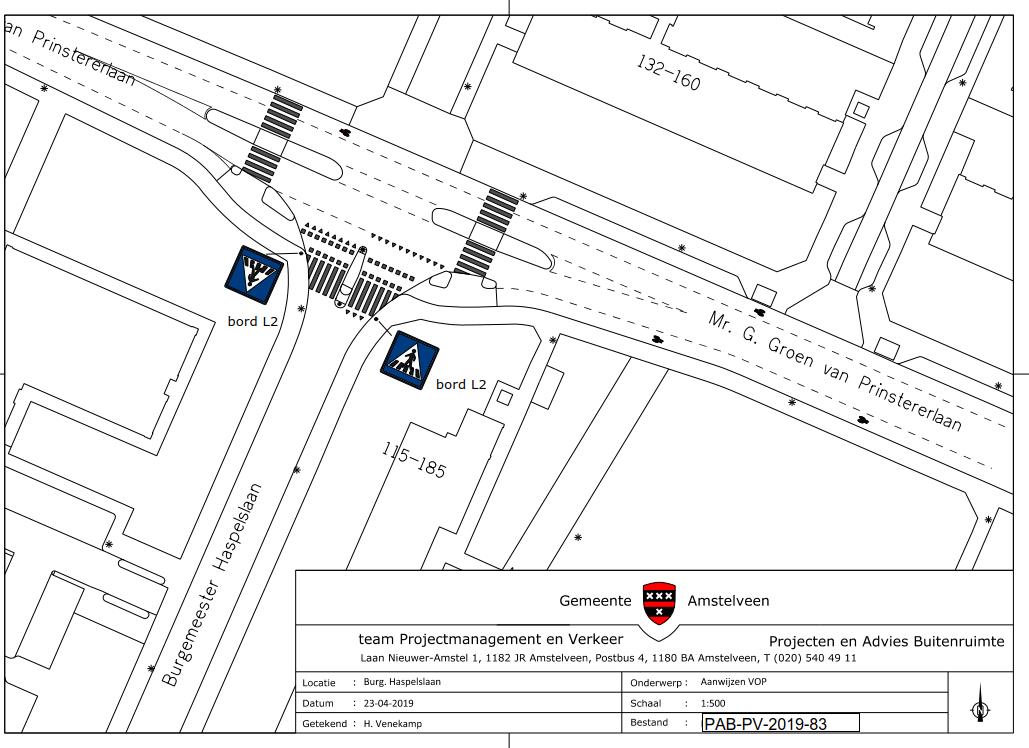 Burgemeester en wethouders van Amstelveen wijzen op de Burgemeester Haspelslaan aan de zuidkant van de kruising met de Mr. G. Groen van Prinstererlaan een voetgangersoversteekplaats aan. Dit gebeurt door het aanbrengen van een zebramarkering op het wegdek en plaatsing van borden L2 van bijlage 1 van het Reglement verkeersregels en verkeerstekens 1990. De voetgangersoversteekplaats is weergegeven op tekening PAB-PV-2019-83.