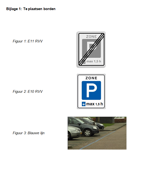 Dit besluit kenbaar maken door de parkeerplaatsen (met uitzondering van de zes gereserveerde parkeerplaatsen) te voorzien van een blauwe streep, die aanduidt welke parkeerplaatsen bedoeld zijn voor de parkeerschijfzone.