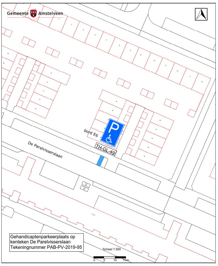 Burgemeester en wethouders van Amstelveen besluiten het parkeren te verbieden op een parkeerplaats inde De Parelvisserslaan, zoals aangegeven op tekening PAB-PV-2019-95, met uitzondering van het voertuig met het kenteken TH-GL-49 (gehandicaptenparkeerplaats).