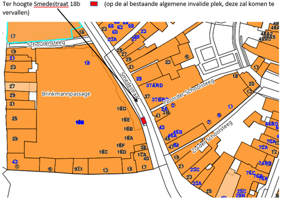 Het aanwijzen van een gehandicaptenparkeerplaats op de Smedestraat door het plaatsen van een bord model E6 (RVV 1990 bijlage 1) voorzien van een onderbord met daarop het kenteken van het voertuig dat in gebruik is bij/ten behoeve van de aanvrager.