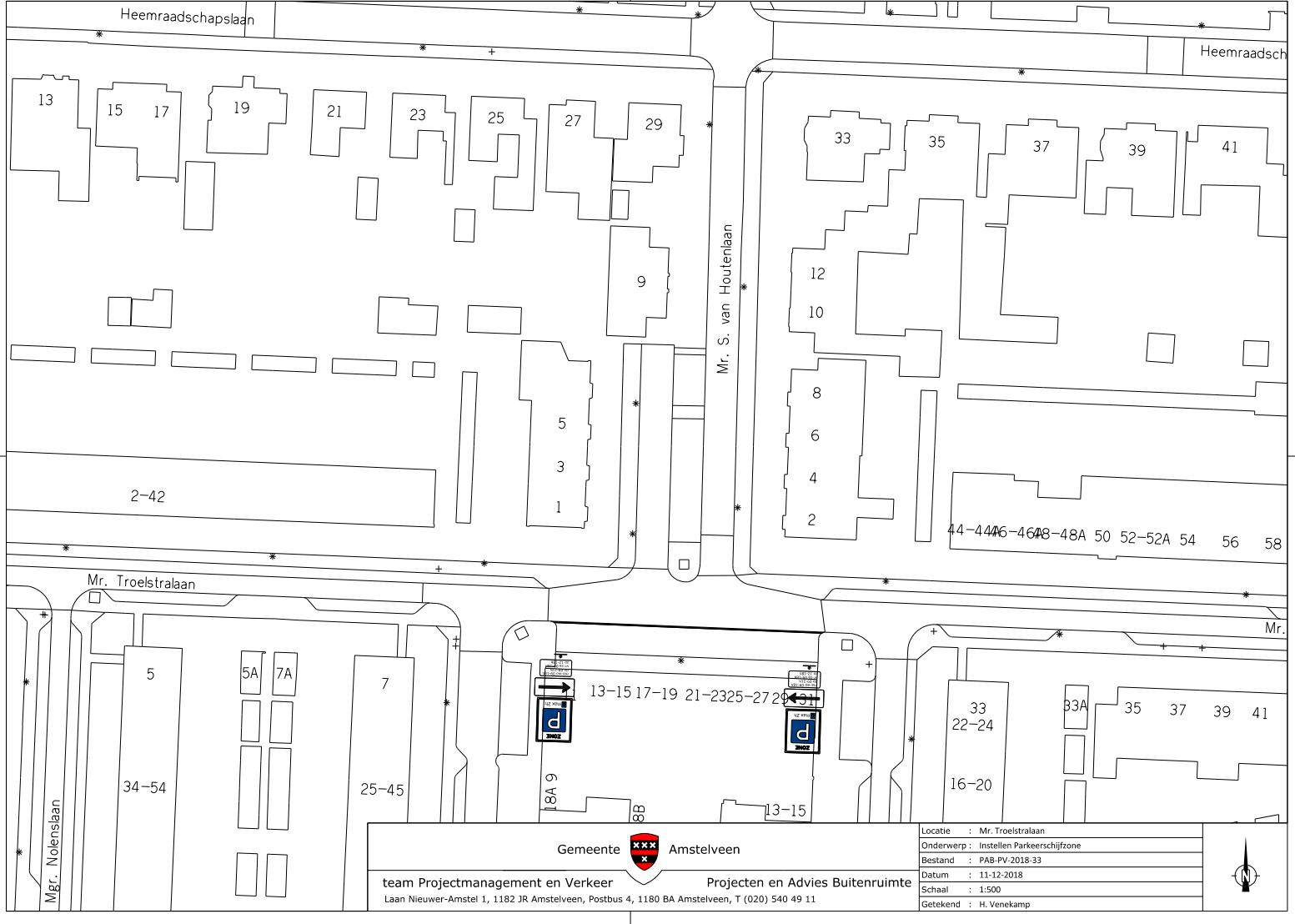 Burgemeester en wethouders van Amstelveen besluiten om de parkeerhaven aan de zuidkant van de Mr. Troelstralaan voor de panden Mr. Troelstralaan 11-31(oneven nummers) aan te wijzen als parkeerschijfzone. De parkeerplaatsen in de parkeerhaven worden voorzien van een blauwe streep. De maximale parkeerduur is 2 uur. De tijden gelden van maandag tot en met zaterdag van 09.00 uur tot 18.00 uur, op donderdag tevens van 18.00 uur tot 21.00 uur en op zondag van 12.00 tot 18.00 uur. Zij geven dit aan met borden E10 en E11 van bijlage 1 van het Reglement verkeersregels en verkeerstekens 1990 met opschrift “max 2h” en door het aanbrengen van een blauwe streep als bedoeld in artikel 25, lid 1, van dit Reglement, zoals aangegeven op tekening PAB-PV-2018-33.