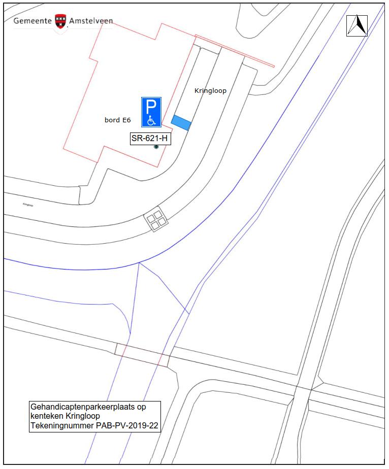 Burgemeester en wethouders van Amstelveen besluiten het parkeren te verbieden op een parkeerplaats op het zuidoostelijke gedeelte van Kringloop, zoals aangegeven op tekening PAB-PV-2019-22, met uitzondering van het voertuig met het kenteken SR-621-H (gehandicaptenparkeerplaats).