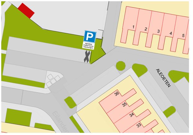 Door het plaatsen van verkeersbord E4 van Bijlage I van het RVV 1990, en een tekstbord “opladen elektrische voertuigen”, in de Aleoeten ter hoogte van huisnummer 36, een parkeergelegenheid vast te stellen voor uitsluitend opladen van een elektrische auto;