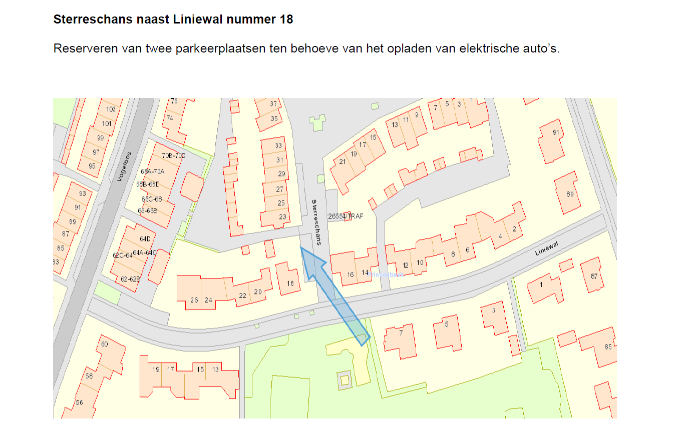 Twee parkeerplaatsen in de Sterreschans naast Liniewal nummer 18 ten behoeve van het opladen van elektrische auto’s. Een en ander zoals weergegeven op de bijgevoegde tekening ‘Sterreschans naast Liniewal nummer 18’.