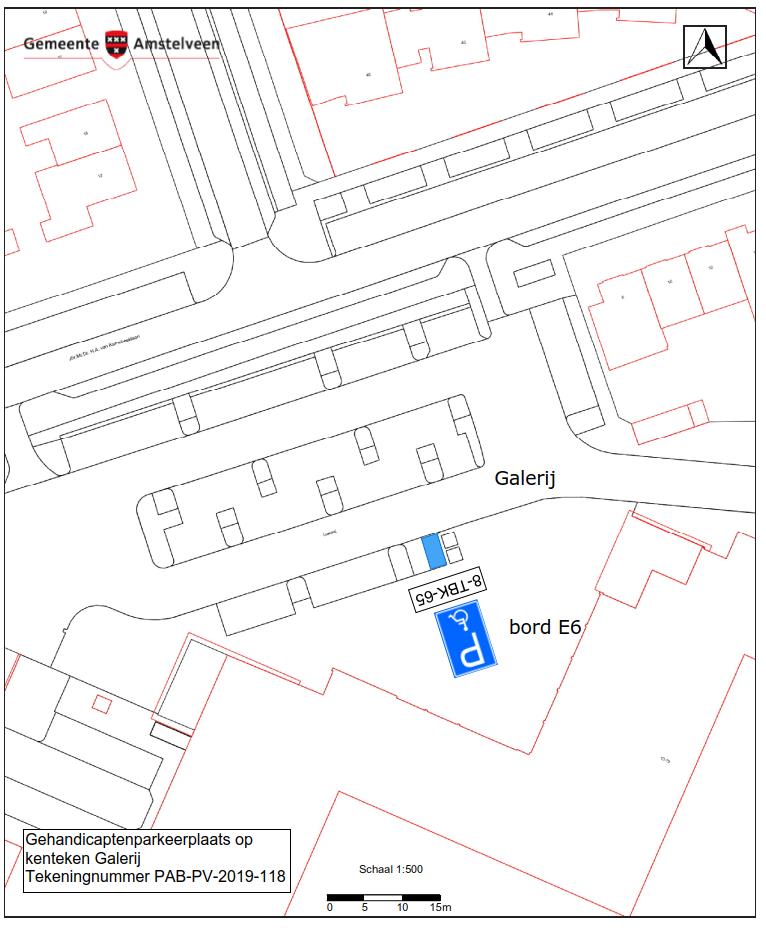 Burgemeester en wethouders van Amstelveen besluiten het parkeren te verbieden op een parkeerplaats op de Galerij, zoals aangegeven op tekening PAB-PV-2019-118, met uitzondering van het voertuig met het kenteken 8-TBK-65 (gehandicaptenparkeerplaats).