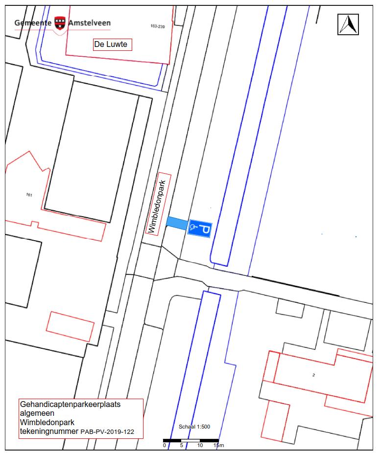 Burgemeester en wethouders van Amstelveen besluiten een gehandicaptenparkeerplaats aan te wijzen op het Wimbledonpark tegenover de ingang van het clubgebouw van de Tennisvereniging DVH, Wimbledonpark 161.
