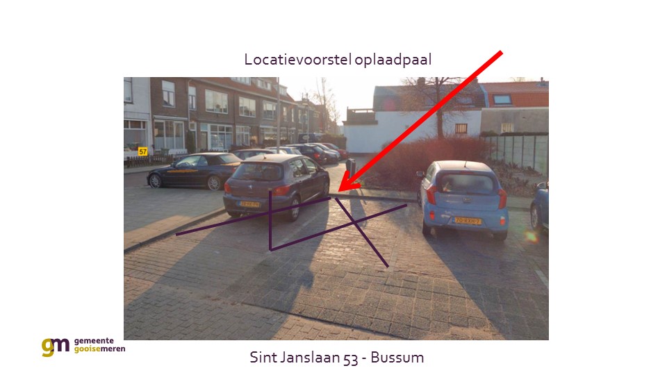De gemeente Gooise Meren heeft naar aanleiding van een verzoek van een (toekomstige) e-rijder besloten om een oplaadpaal te laten plaatsen in de Sint Janslaan te Bussum ter hoogte van het pand met huisnummer 53. Op de foto onder punt 8 staat de beoogde locatie van de oplaadpaal weergegeven.