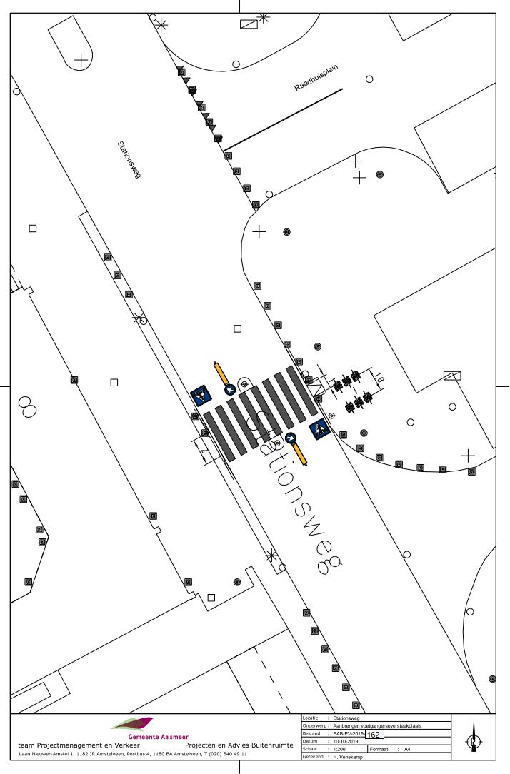 Burgemeester en wethouders van Aalsmeer wijzen een voetgangersoversteekplaats aan op de rijbaan van de Stationsweg aan de zuidkant van de kruising met het Raadhuisplein. Dit gebeurt door het aanbrengen van een zebramarkering op het wegdek en plaatsing van borden D2 en L2 van bijlage 1 van het Reglement verkeersregels en verkeerstekens 1990. De voetgangersoversteekplaats is weergegeven op tekening PAB-PV-2019-162.