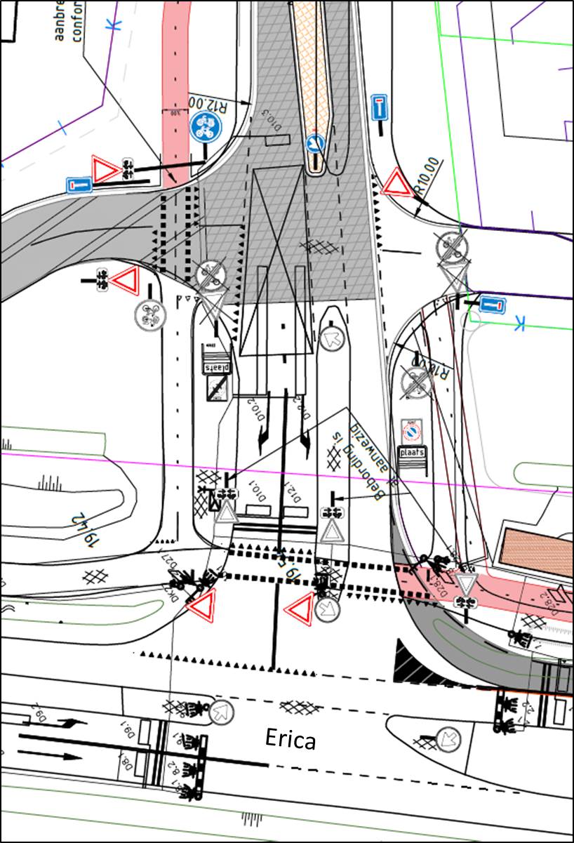 - dat de Erica en het aanliggende (brom)fietspad een weg van een hogere orde is en daarom voorrang dient te krijgen op de centrale ontsluitingsas van het bedrijventerrein en de daaraan liggende (brom)fietspaden;