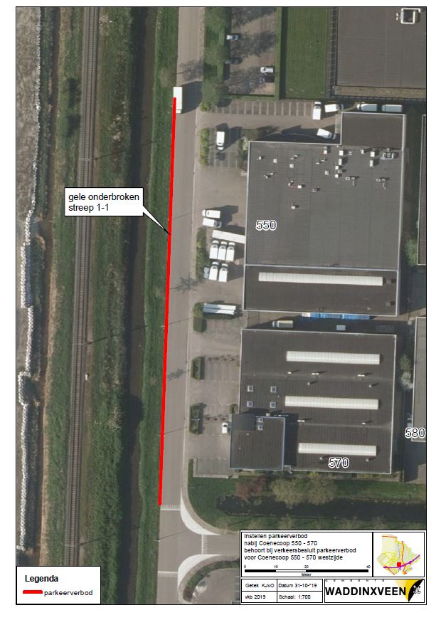 Uit het oogpunt van het in stand houden van de weg en het waarborgen van de bruikbaarheid daarvan en het zo veel mogelijk waarborgen van de vrijheid van het verkeer is het gewenst om op de Coenecoop, tussen de noordrand van perceel 530 en het kruispunt ten zuiden van perceel 570 over te gaan tot het instellen van een parkeerverbod met gele onderbroken strepen, zodat de bereikbaarheid van de percelen 550 en 570 voor grote voertuigen verbetert.