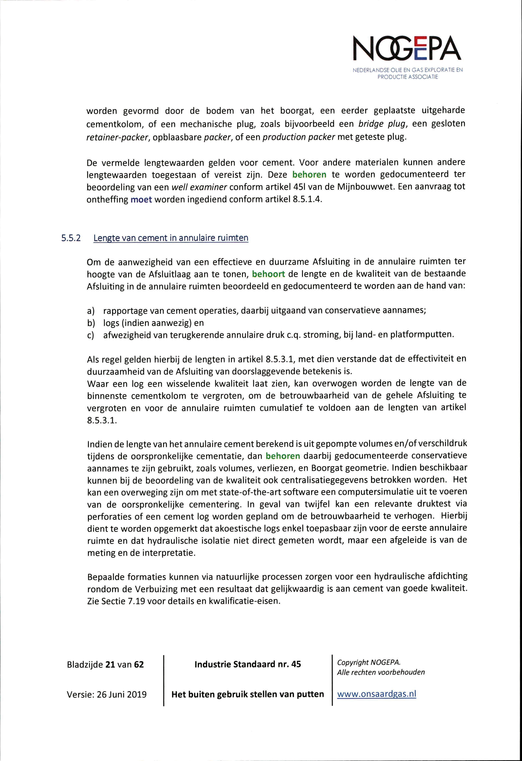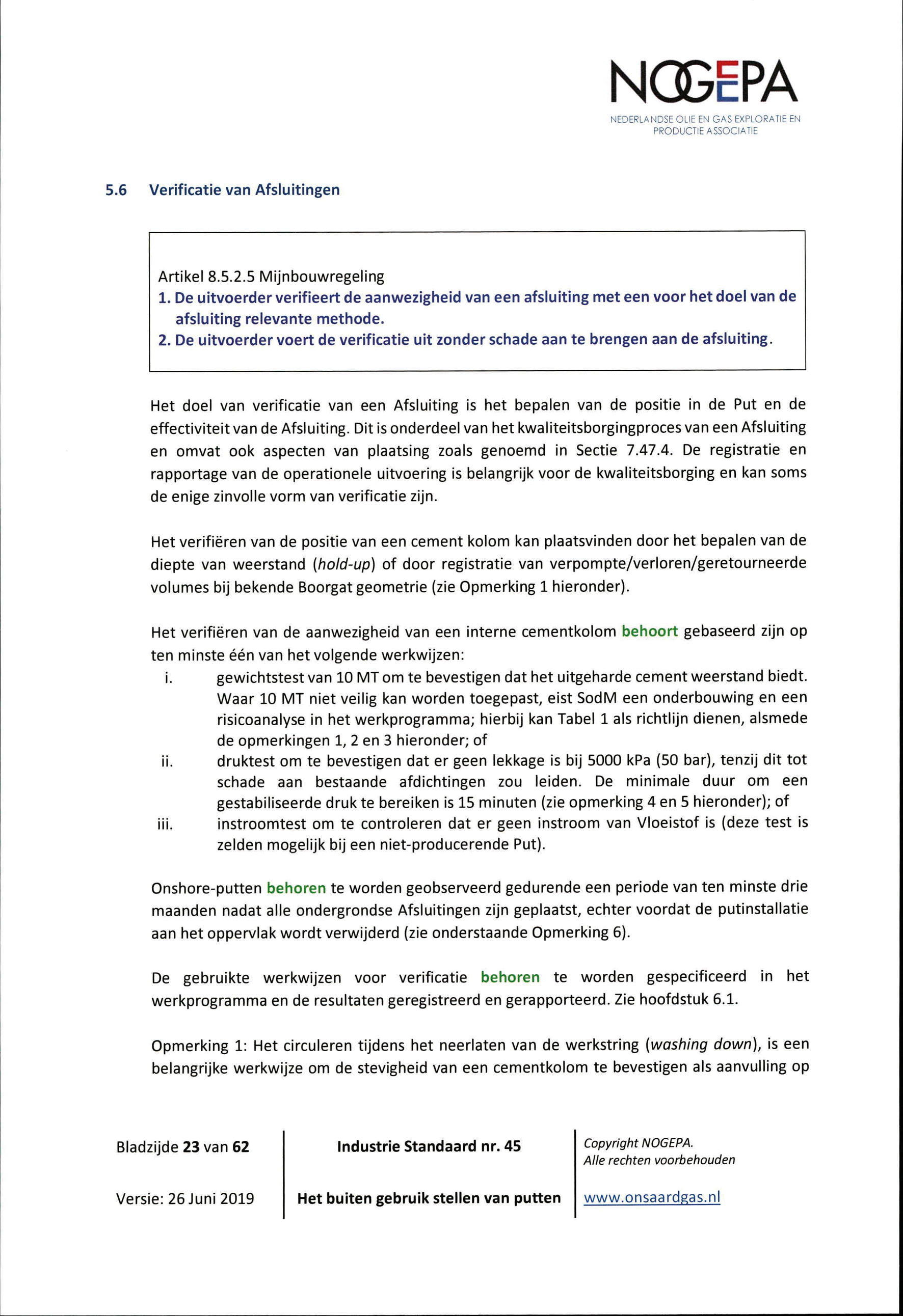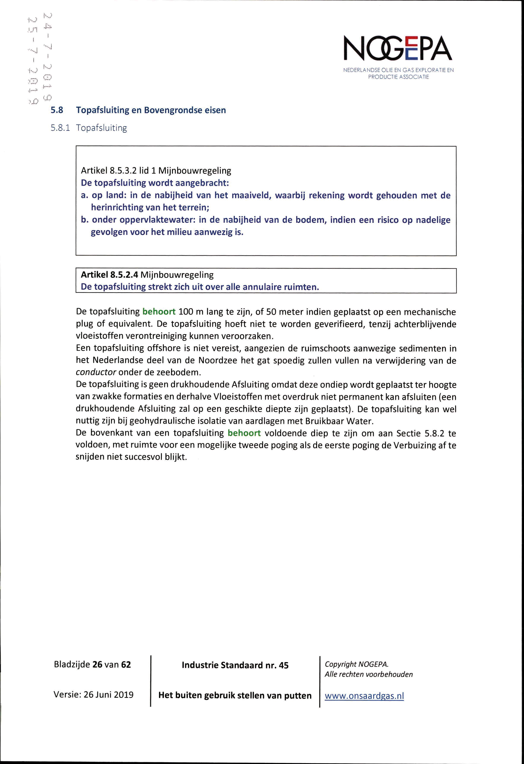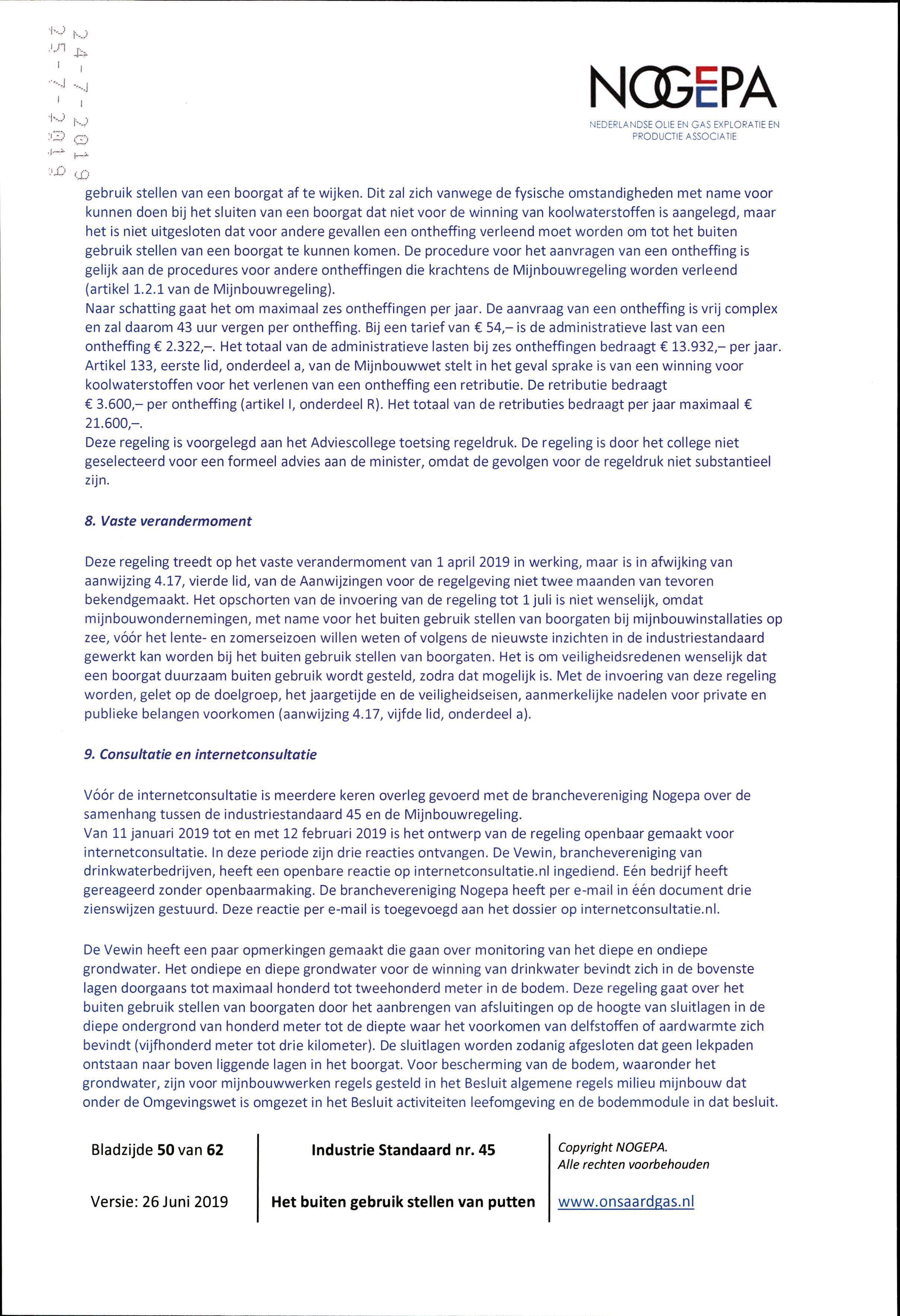 De nadere technische details voor de uitvoering van afdeling 8.5 van de Mijnbouwregeling zijn door de branchevereniging van gas- en olie- exploiterende bedrijven, Nogepa, uitgewerkt in de Industriestandaard nr.45, het buiten gebruik stellen van putten, van 26 juni 2019, die in bijlage I bij dit besluit bekend is gemaakt. De Industriestandaard nr.45 is door de inspecteur-generaal der mijnen beoordeeld als een goede praktijk voor de uitvoering van het buiten gebruik stellen van boorgaten en putten.