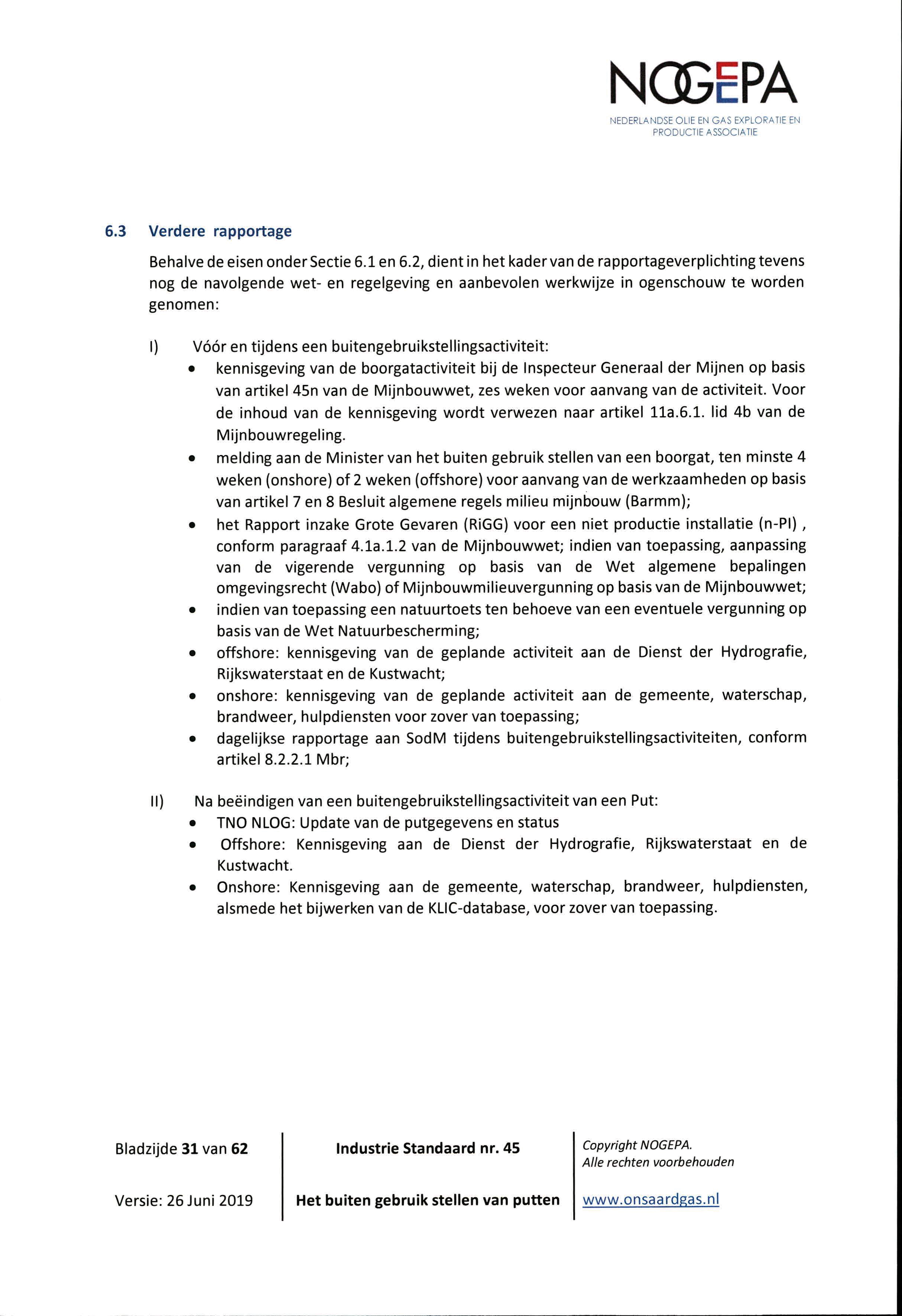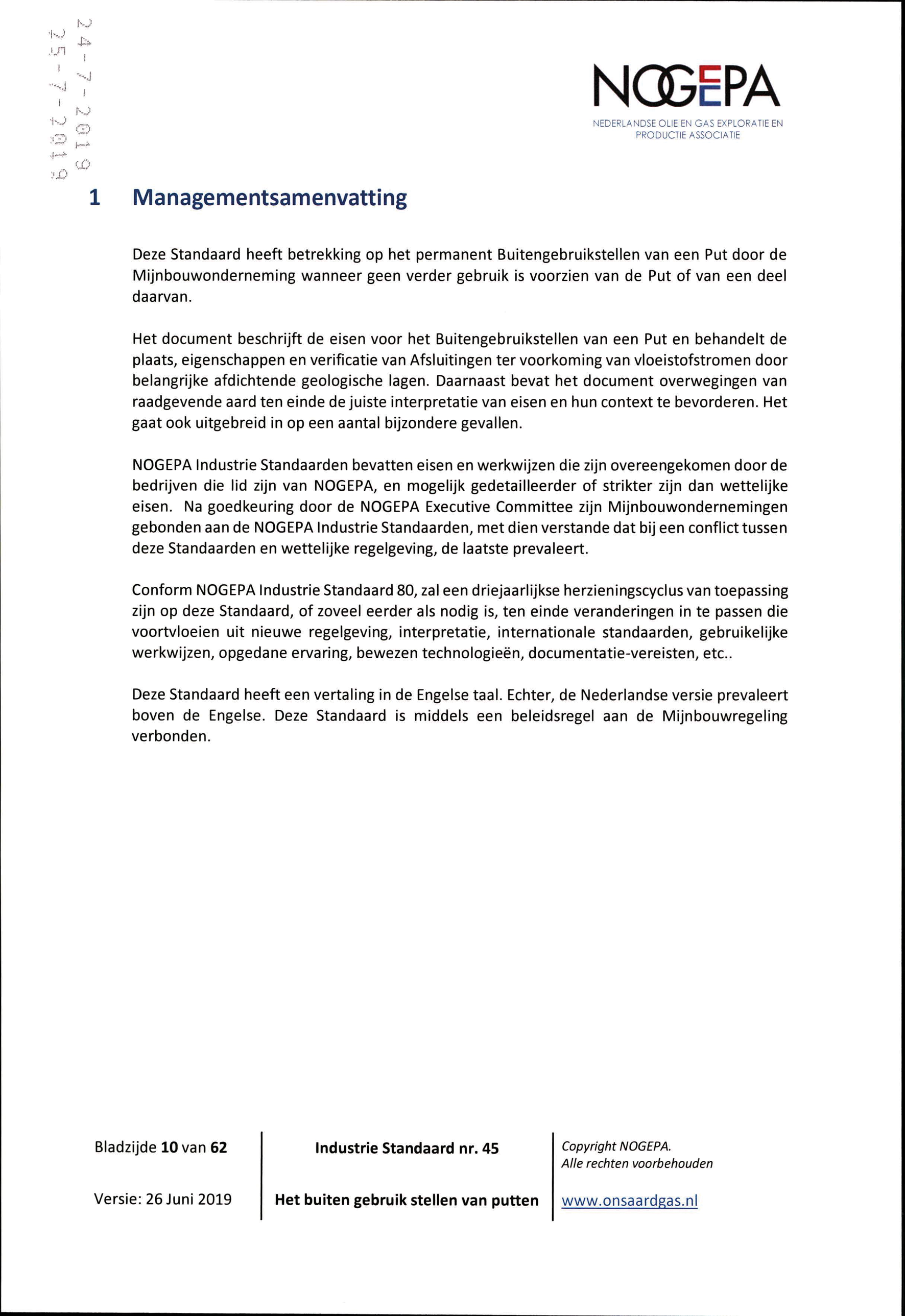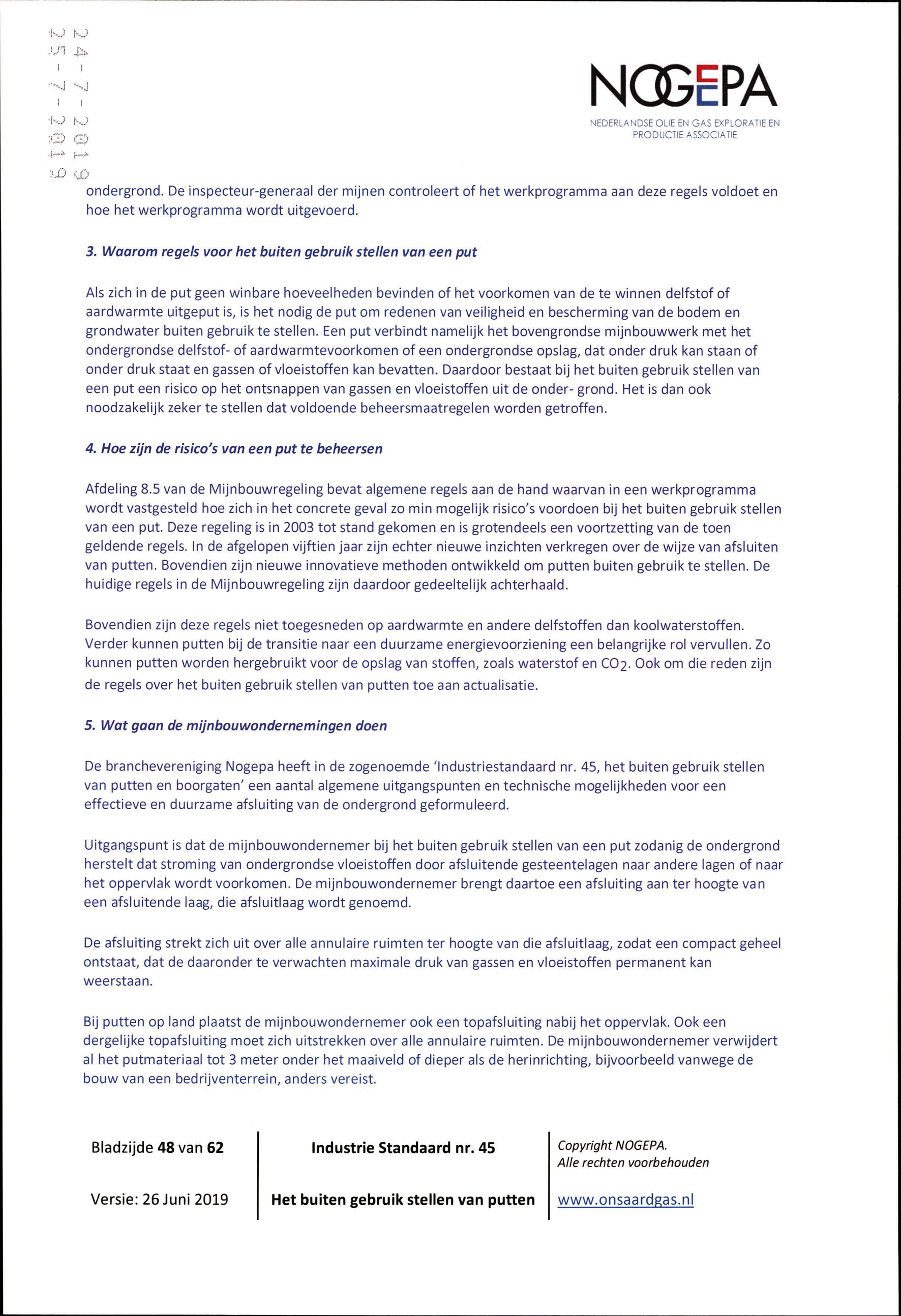 De nadere technische details voor de uitvoering van afdeling 8.5 van de Mijnbouwregeling zijn door de branchevereniging van gas- en olie- exploiterende bedrijven, Nogepa, uitgewerkt in de Industriestandaard nr.45, het buiten gebruik stellen van putten, van 26 juni 2019, die in bijlage I bij dit besluit bekend is gemaakt. De Industriestandaard nr.45 is door de inspecteur-generaal der mijnen beoordeeld als een goede praktijk voor de uitvoering van het buiten gebruik stellen van boorgaten en putten.
