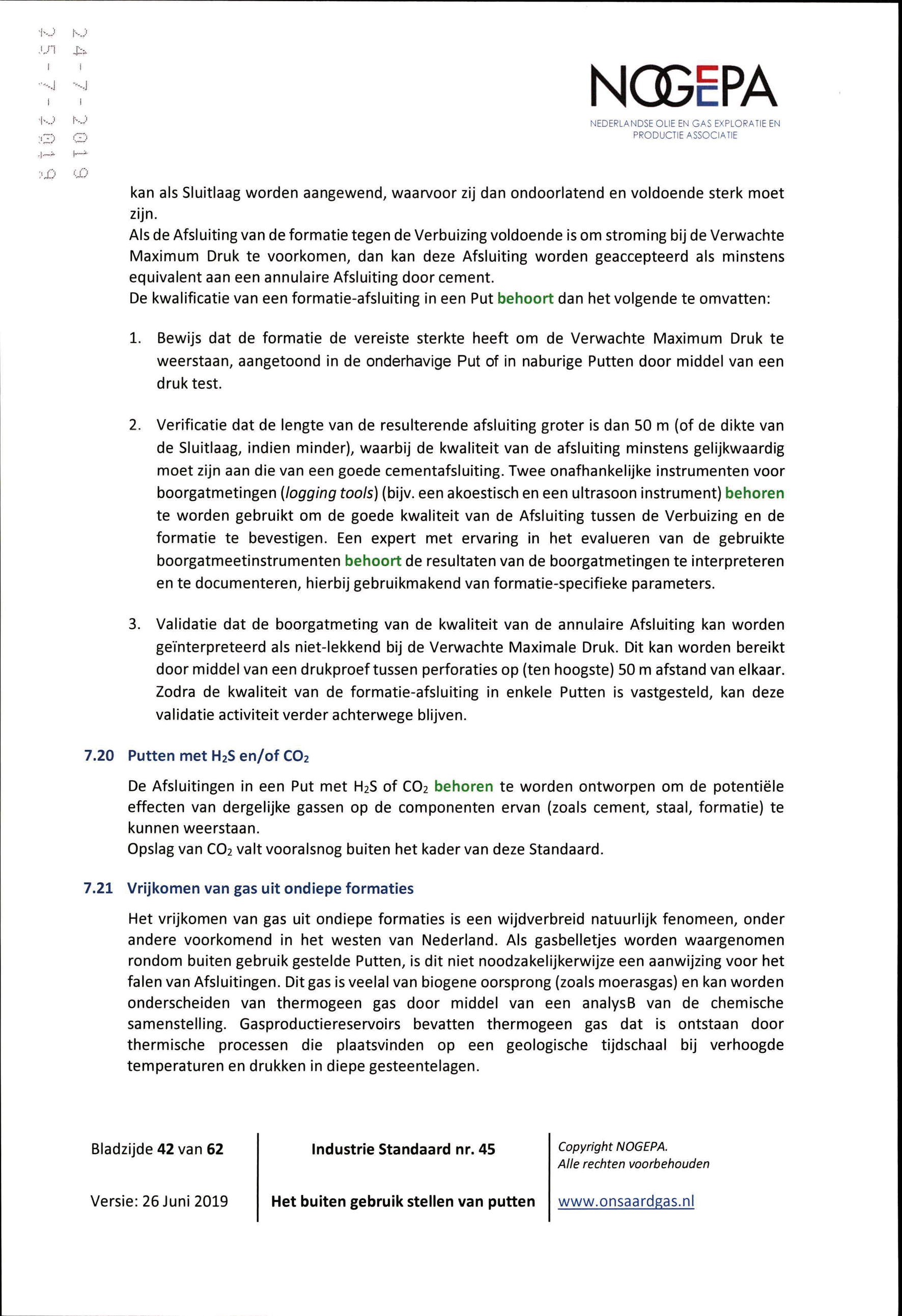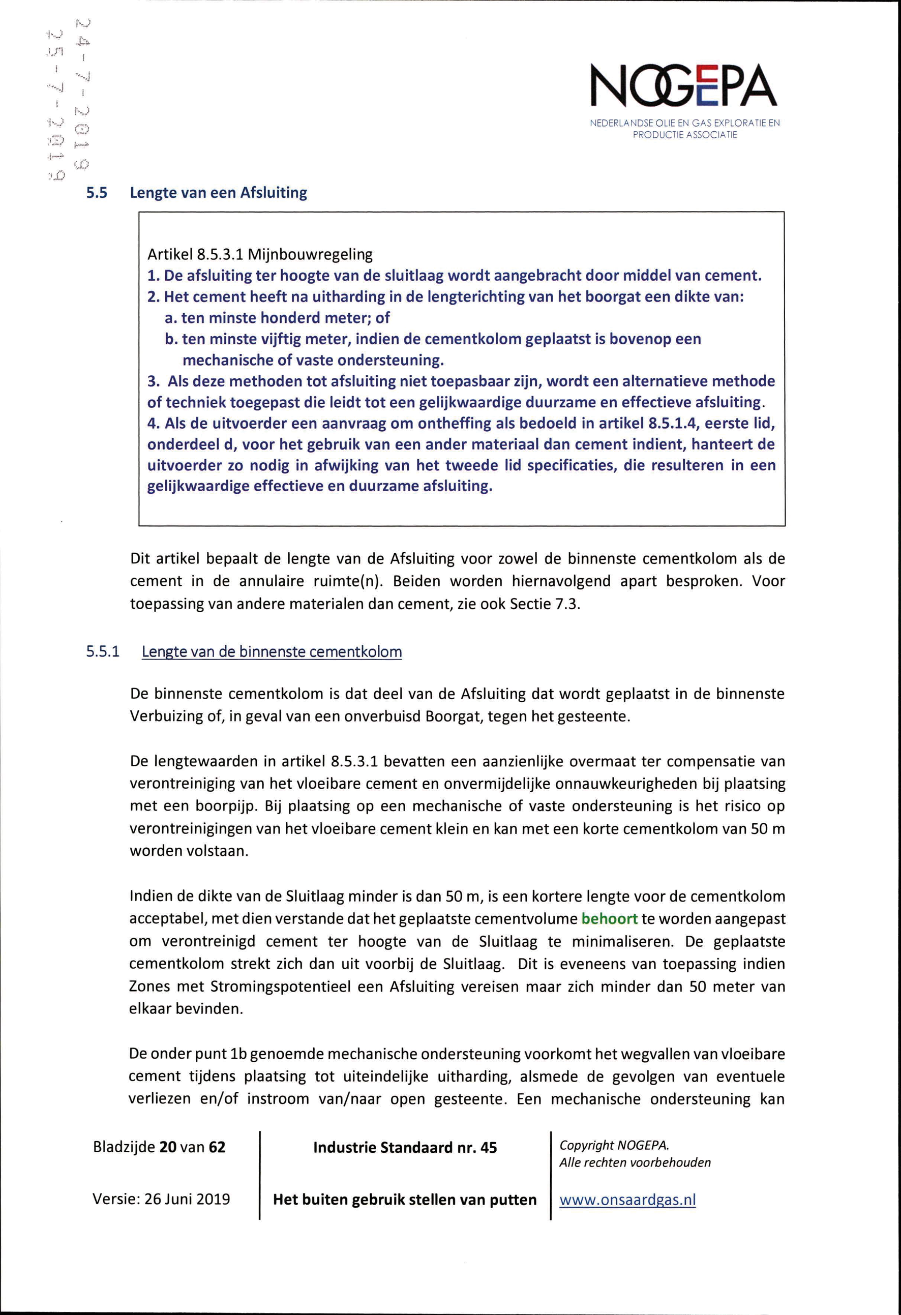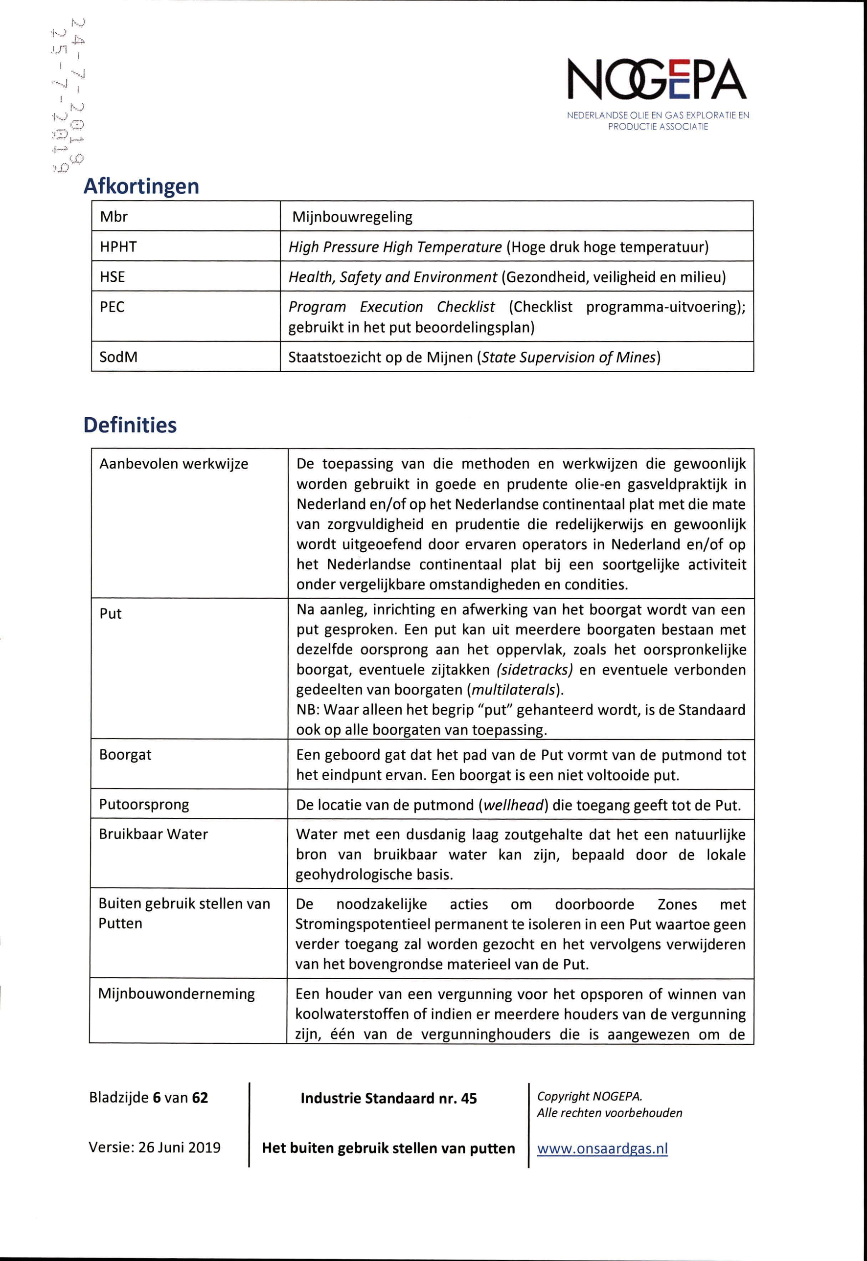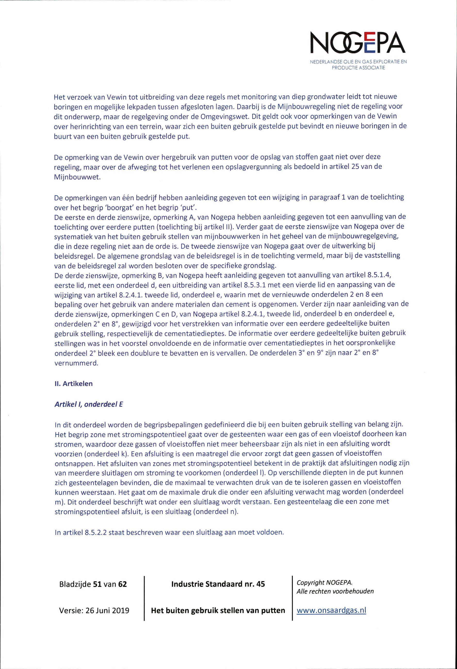 De nadere technische details voor de uitvoering van afdeling 8.5 van de Mijnbouwregeling zijn door de branchevereniging van gas- en olie- exploiterende bedrijven, Nogepa, uitgewerkt in de Industriestandaard nr.45, het buiten gebruik stellen van putten, van 26 juni 2019, die in bijlage I bij dit besluit bekend is gemaakt. De Industriestandaard nr.45 is door de inspecteur-generaal der mijnen beoordeeld als een goede praktijk voor de uitvoering van het buiten gebruik stellen van boorgaten en putten.