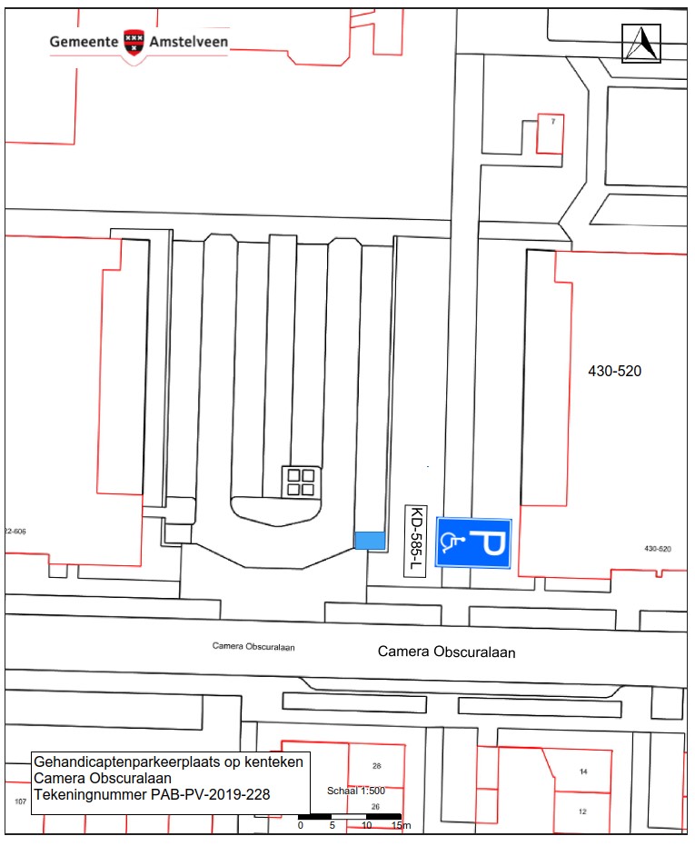 Burgemeester en wethouders van Amstelveen besluiten het parkeren te verbieden op een parkeerplaats op het parkeerterrein bij het flatgebouw Camera Obscuralaan 430-520 (even nummers), zoals aangegeven op tekening PAB-PV-2019-228, met uitzondering van het voertuig met het kenteken KD-585-L (gehandicaptenparkeerplaats).