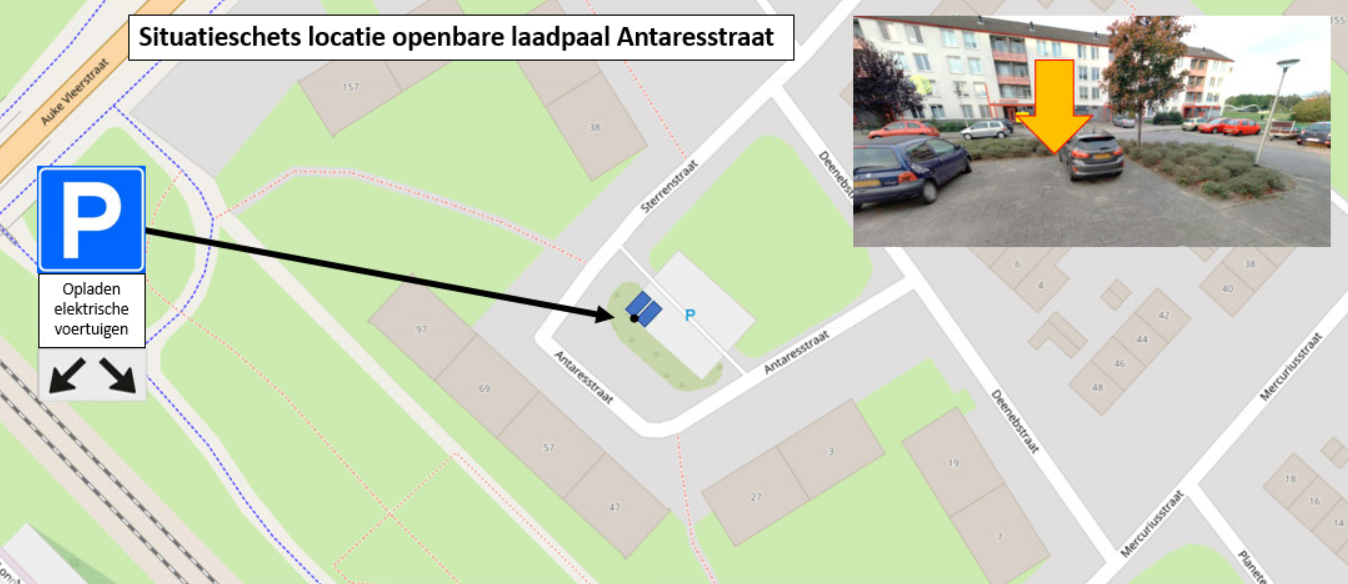 - door middel van het plaatsen van het verkeersbord E4 van bijlage 1 van het RVV 1990 met een onderbord met de tekst ‘opladen elektrische voertuigen’ – en een onderbord met pijlen, waaruit blijkt dat het bord voor twee parkeerplaatsen van toepassing is – op de Antaresstraat, een tweetal parkeerplaatsen te reserveren ten behoeve van het opladen van elektrische voertuigen.
