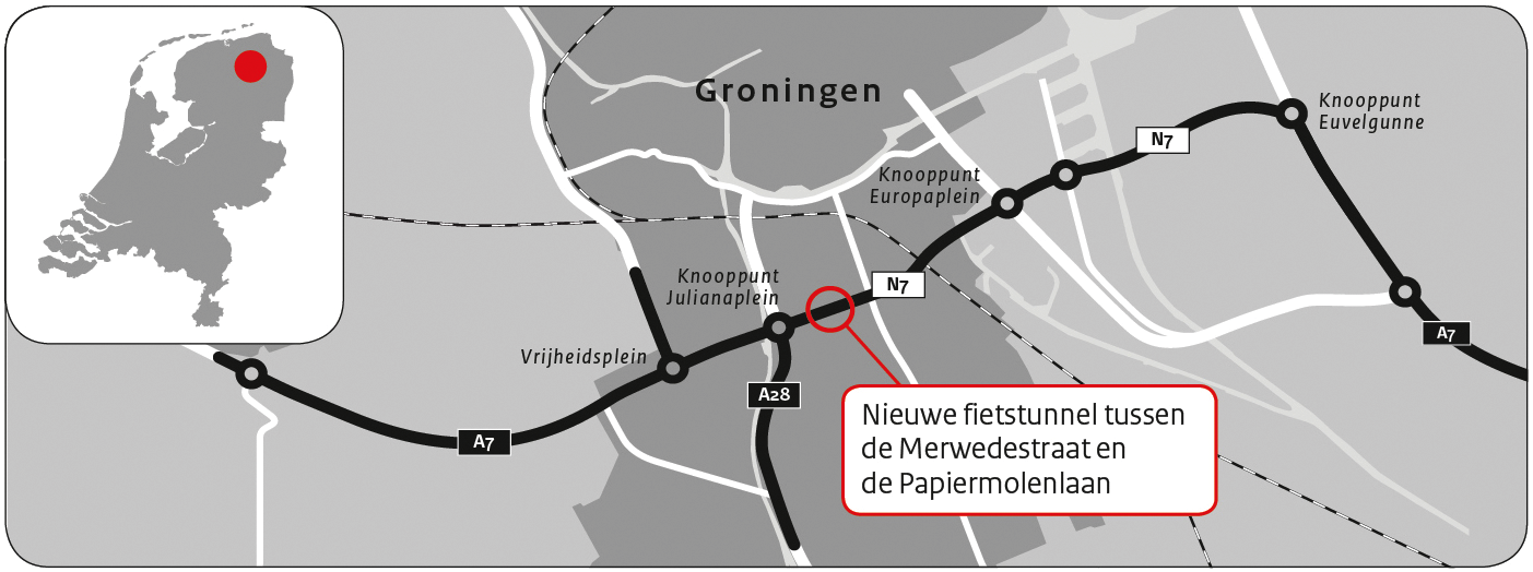 • 3. Om de fietstunnel te kunnen inpassen, wordt de nieuwe verbindingsweg railleweg – Hereweg verhoogd. De Maaslaan en de Merwedestraat worden bij de fietstunnel verlaagd.