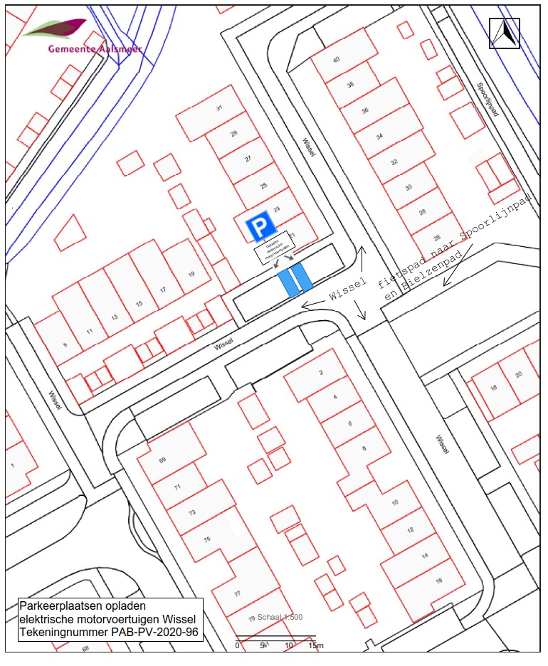 Burgemeester en wethouders van Aalsmeer besluiten om op het noordelijk deel van Wissel ten westen van het fietspad naar het Spoorlijnpad en het Bielzenpad twee parkeerplaatsen aan te wijzen als parkeerplaats voor het opladen van elektrische motorvoertuigen. De parkeerplaatsen mogen alleen gebruikt worden voor het opladen van deze elektrische motorvoertuigen.