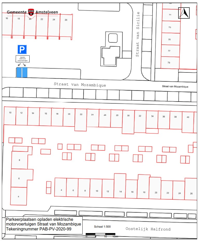 Burgemeester en wethouders van Amstelveen besluiten om in het noordwestelijke deel van de Straat van Mozambique twee parkeerplaatsen aan te wijzen als parkeerplaats voor het opladen van elektrische motorvoertuigen. De parkeerplaatsen mogen alleen gebruikt worden voor het opladen van deze elektrische motorvoertuigen.