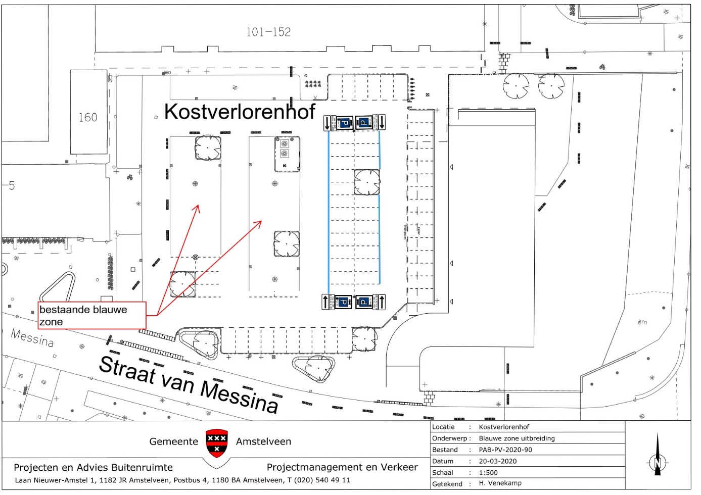 Burgemeester en wethouders van Amstelveen besluiten om op het oostelijke deel van het parkeerterrein op Kostverlorenhof ten zuiden van het gebouw Kostverlorenhof 101-152 23 bij elkaar gelegen parkeerplaatsen aan te wijzen als de parkeerschijfzone. De maximale parkeerduur is 2 uur. De tijden gelden van maandag van 13.00 uur tot 18.00 uur en van dinsdag tot en met zaterdag van 09.00 uur tot 18.00 uur. Zij geven dit aan met borden E10 en E11 van bijlage 1 van het Reglement verkeersregels en verkeerstekens 1990 (RVV 1990) met opschrift “max 2h” en door het aanbrengen van blauwe strepen als bedoeld in artikel 25, lid 1, van dit Reglement, zoals aangegeven op tekening PAB-PV-2020-90.