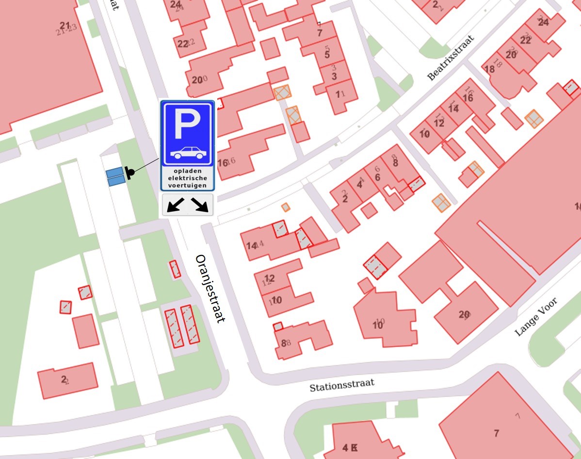 Door plaatsing van het verkeersbord E08 met een onderbord met de tekst ‘opladen elektrische voertuigen’ en een onderbord met pijlen, blijkt dat het bord voor twee parkeerplaatsen van toepassing is. Dit bord wordt geplaatst op het parkeerterrein aan de Oranjestraat ter hoogte van huisnummer 18. Hiermee worden een tweetal parkeerplaatsen gereserveerd ten behoeve van het opladen van elektrische voertuigen.