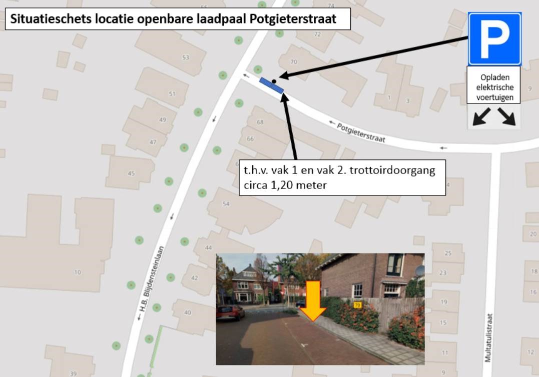 door middel van het plaatsen van het verkeersbord E4 van bijlage 1 van het RVV 1990 met een onderbord met de tekst ‘opladen elektrische voertuigen’ – en een onderbord met pijlen, waaruit blijkt dat het bord voor twee parkeerplaatsen van toepassing is – op de Potgieterstraat, een tweetal parkeerplaatsen te reserveren ten behoeve van het opladen van elektrische voertuigen.