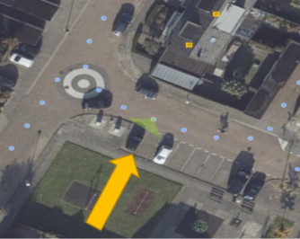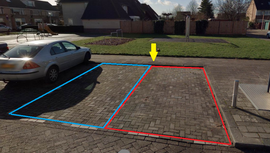 Blauwe markering= Besluit punt 2: In de toekomst te realiseren extra parkeervak voor opladen elektrische voertuigen. Geel=aangewezen locatie voor oplaadpaal en bord E4)