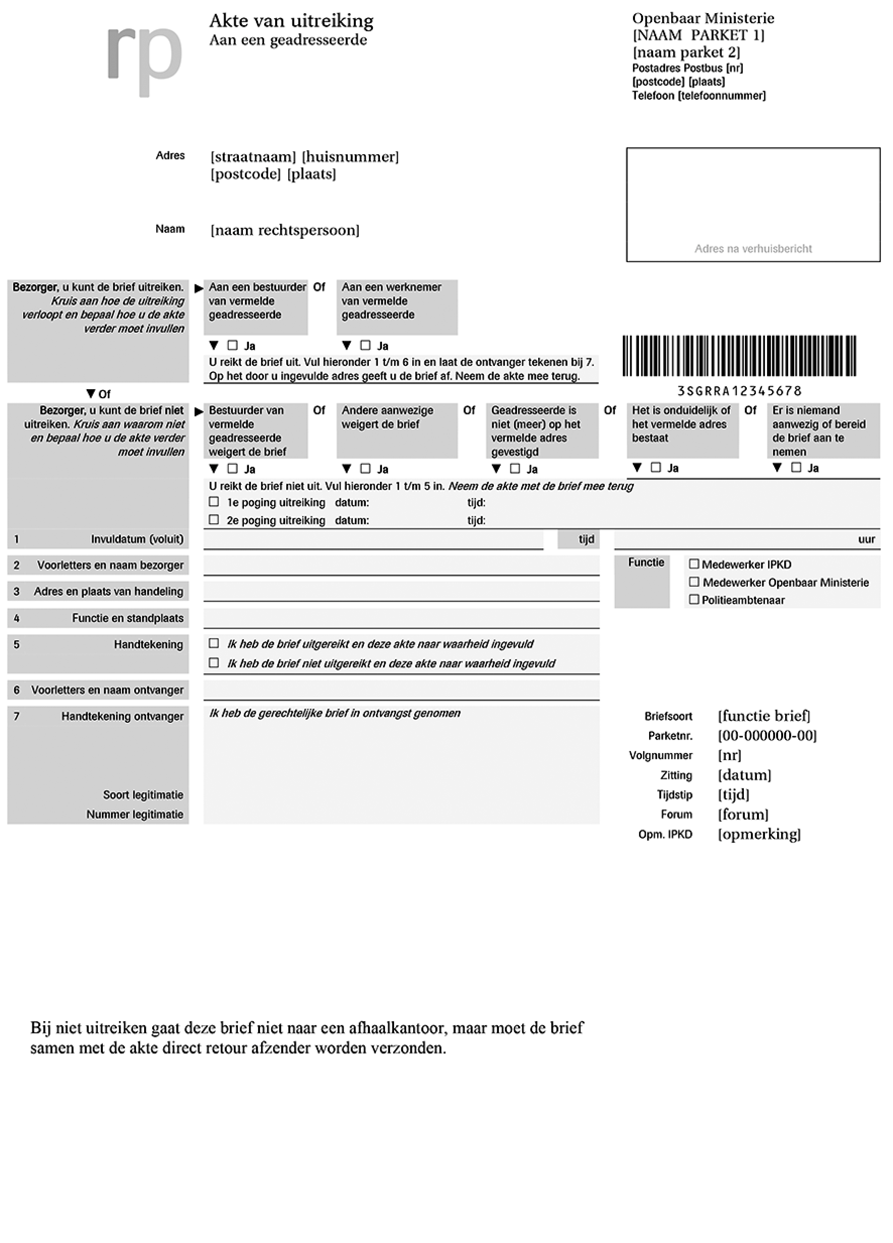 Het normale proces van uitreiking van een gerechtelijke mededeling wordt van nature gekenmerkt, ten eerste, door het feit dat personen (enerzijds de uitreikende functionaris en anderzijds de ontvanger van de mededeling) fysiek in elkaars directe nabijheid verkeren en, ten tweede, door de overhandiging of uitwisseling van voorwerpen (de gerechtelijke mededeling, de akte van uitreiking, een legitimatiebewijs, schrijfgerei). Gelet op deze kenmerken van dit proces en met het oog op de minimalisering van het besmettingsrisico tijdens de uitreiking van gerechtelijke mededelingen is de werkinstructie voor tot uitreiking bevoegde personen in deze zin gewijzigd dat zij er, desgewenst, steeds voor mogen kiezen de ontvanger niet te laten tekenen voor ontvangst.