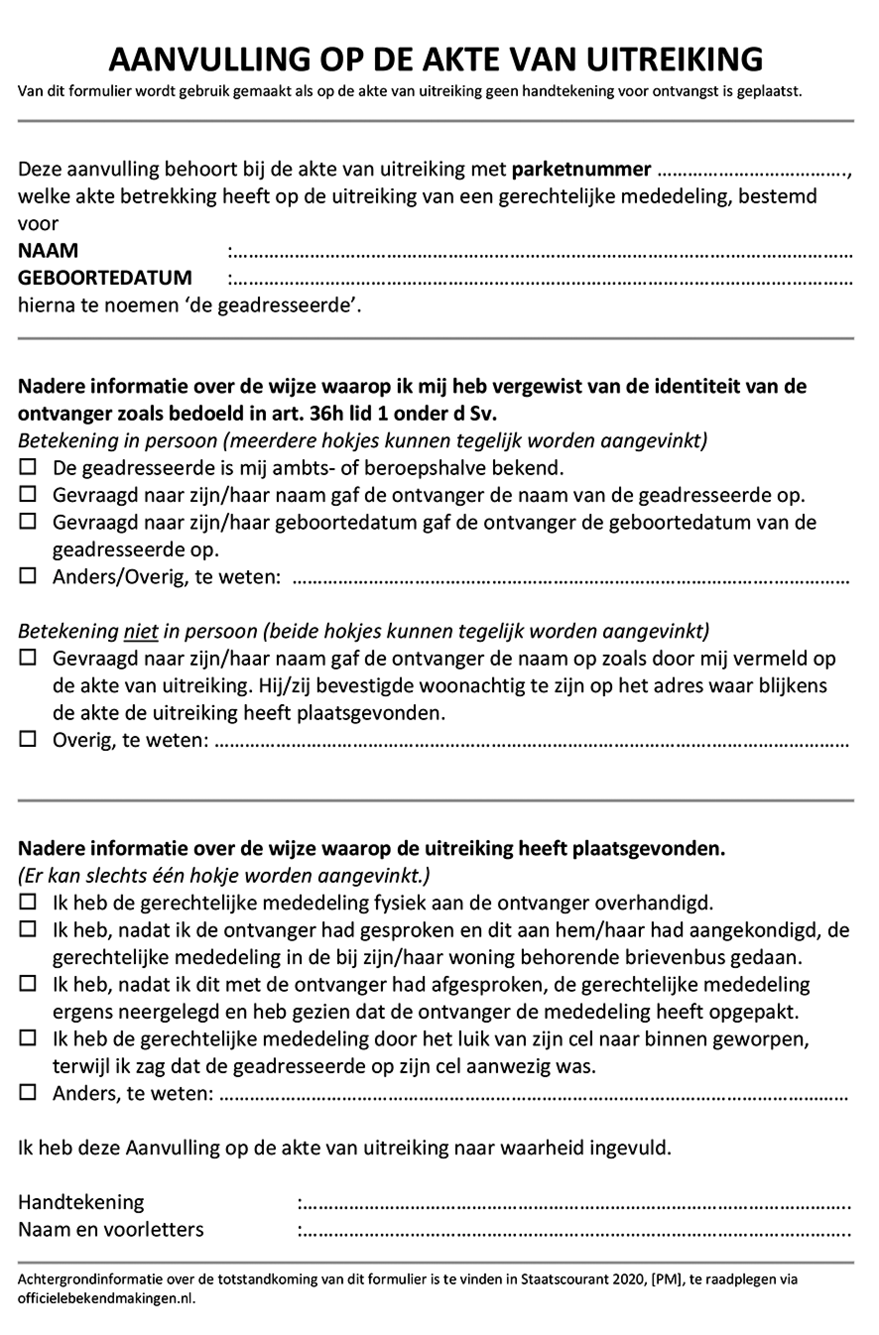 Artikel 2 voorziet in een Aanvulling op de akte van uitreiking voor die gevallen dat zij daarvoor kiezen. In die gevallen zal gebruik moeten worden gemaakt van het formulier waarvoor door middel van deze regeling een model wordt gepresenteerd (Aanvulling op de akte van uitreiking). Hoewel de handtekening voor ontvangst geen wettelijk vereiste is, levert deze handtekening, indien geplaatst, onder normale omstandigheden voor de professionele gebruiker van de akte (het Openbaar Ministerie, de rechter, de raadsman) vaak een aanvullende zekerheid op voor de uitreiking aan de persoon die de handtekening heeft geplaatst, zeker wanneer een en ander ook nog gepaard is gegaan met het op de akte noteren van het nummer van een getoond legitimatiebewijs. Om het wegvallen van deze aanvullende zekerheid te compenseren is deze Aanvulling op de akte van uitreiking in het leven geroepen. De Aanvulling dient ertoe om de professionele gebruiker van de akte van relevante achtergrondinformatie te voorzien. Ten eerste is die achtergrondinformatie toegespitst op onderdeel d van het eerste lid van artikel 36h van het Wetboek van Strafvordering. Aan de gebruiker van de akte wordt inzicht gegeven in de manier waarop en de mate waarin de uitreiker van de gerechtelijke mededeling zich heeft vergewist van de identiteit van de ontvanger ervan. Anderzijds is de achtergrondinformatie bedoeld om, waar van toepassing, de professionele gebruiker van de akte in de gelegenheid te stellen het in-persoonkarakter van de uitreiking te toetsen.