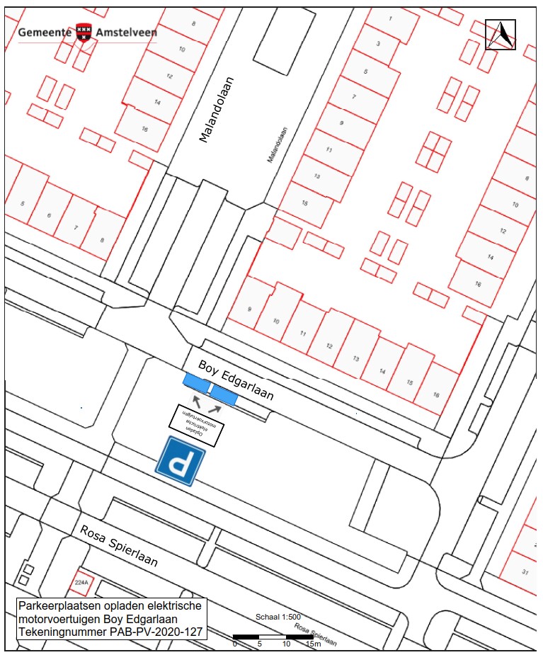 Burgemeester en wethouders van Amstelveen besluiten om twee parkeerplaatsen in de Boy Edgarlaan aan te wijzen als parkeerplaats voor het opladen van elektrische motorvoertuigen. De parkeerplaatsen mogen alleen gebruikt worden voor het opladen van deze elektrische motorvoertuigen.