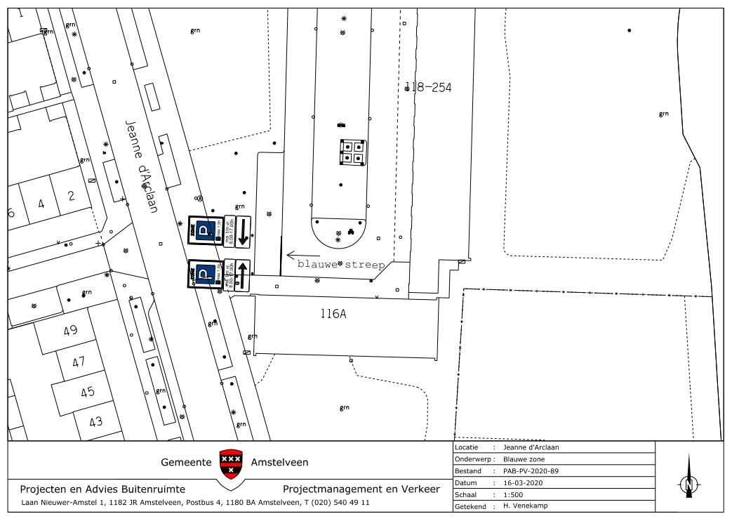 Burgemeester en wethouders van Amstelveen besluiten om twee naast elkaar gelegen parkeerplaatsen op het parkeerterrein bij het adres Jeanne d’Arclaan 116A aan te wijzen als parkeerschijfzone. De maximale parkeerduur is 1,5 uur. De tijden gelden van maandag tot en met vrijdag van 08.00 uur tot 17.00 uur. Zij geven dit aan met borden E10 van bijlage 1 van het Reglement verkeersregels en verkeerstekens 1990 met opschrift “max 1,5h” en onderborden en door het aanbrengen van een blauwe streep als bedoeld in artikel 25, lid 1, van dit Reglement, zoals weergegeven op tekening PAB-PV-2020-89.
