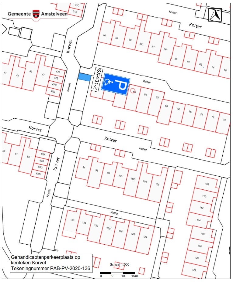 Burgemeester en wethouders van Amstelveen besluiten het parkeren te verbieden op een parkeerplaats op het zuidoostelijke deel van Korvet, zoals aangegeven op tekening PAB-PV-2020-136, met uitzondering van het voertuig met het kenteken SX-531-Z (gehandicaptenparkeerplaats).