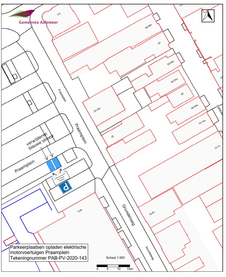 Burgemeester en wethouders van Aalsmeer besluiten om twee parkeerplaatsen op het Praamplein aan te wijzen als parkeerplaats voor het opladen van elektrische motorvoertuigen. De parkeerplaatsen mogen alleen gebruikt worden voor het opladen van deze elektrische motorvoertuigen.