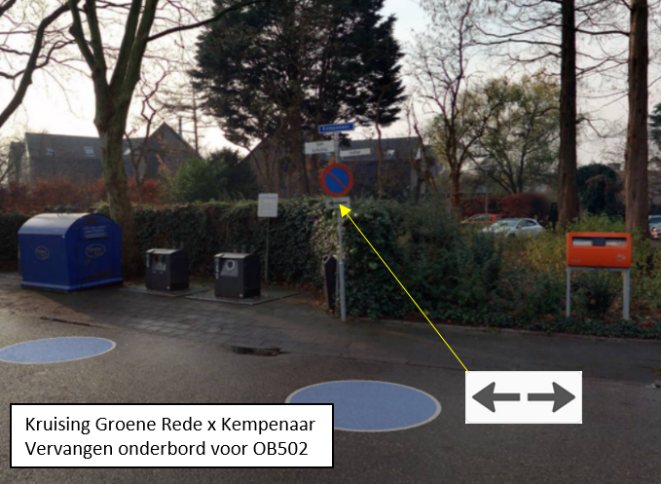 het reeds, conform bijlage 1 van het RVV 1990, gecombineerd met bord E01, geplaatste onderbord OB501-L, aan de zuidzijde van de rijbaan gelegen, ter hoogte van de kruising met de Groene Rede, voor onderbord OB502.
