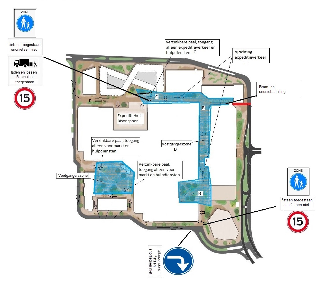 Een voetgangerszone, waarbinnen fietsers zonder kenteken en laad- en losverkeer (expeditie route) met een maximum snelheid van 15km/u (stapvoets) voor de aangrenzende winkels is toegestaan, in te stellen door het plaatsen van verkeersborden A1 en G7 (zone) van Bijlage 1 van het RVV 1990 voorzien van onderbord met tekstopschrift: “fietsen toegestaan, snorfietsen niet” en onderbord met tekstopschrift: “<pictogram vrachtwagen> laden en lossen Bisonallee toegestaan”;