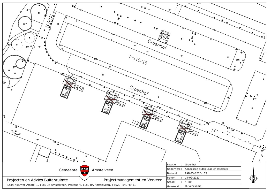 Burgemeester en wethouders van Amstelveen besluiten om de tijden van de parkeergelegenheid voor het onmiddellijk laden en lossen van goederen aan de zuidkant van het gedeelte van Groenhof dat aan de achterzijde van het gebouw Groenhof 1-110 ligt vast te stellen van 07.00 uur tot 19.00 uur.