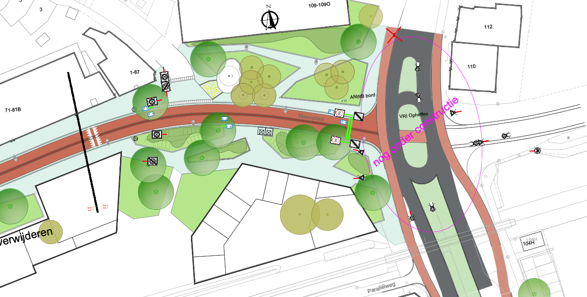 dat daarom onder andere het profiel van de wegen wordt versmald naar 5,5 meter breed en een roodkleurige verharding wordt aangebracht;