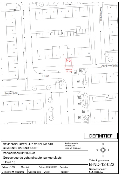 Barendrecht verkeersbesluit gereserveerde gehandicaptenparkeerplaats ’t Fruit 13.