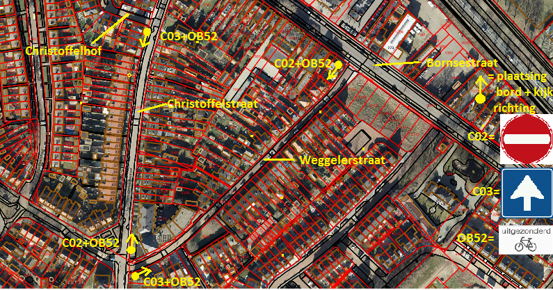 De gekozen rijrichtingen leveren een duidelijkere verkeerssituatie op. Daar op het gedeelte tussen Bornsestraat en Christoffelhof verkeer in twee richtingen mogelijk blijft, hoeft er bij de gekozen rijrichting geen vooraankondigingsbord ter hoogte van de aansluiting met de Bornsestraat te worden geplaatst (wat bij een C2-bord wel had gemoeten).
