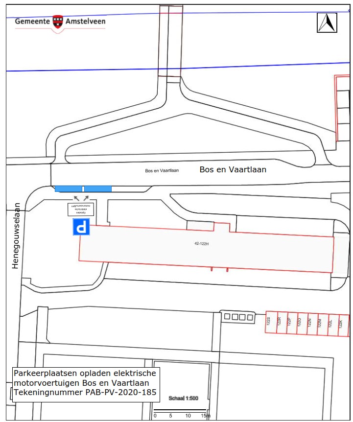 Burgemeester en wethouders van Amstelveen besluiten om in de Bos en Vaartlaan ten oosten van de kruising met de Henegouwselaan twee parkeerplaatsen aan te wijzen als parkeerplaats voor het opladen van elektrische motorvoertuigen. De parkeerplaatsen mogen alleen gebruikt worden voor het opladen van deze elektrische motorvoertuigen.