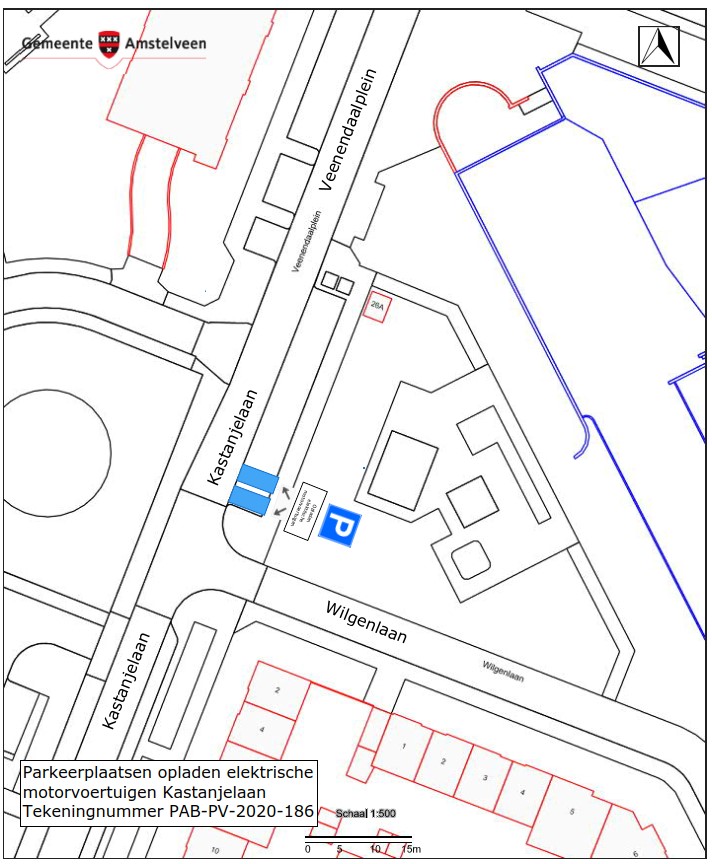 Burgemeester en wethouders van Amstelveen besluiten om aan de oostkant van de Kastanjelaan ten noorden van de kruising met de Wilgenlaan twee parkeerplaatsen aan te wijzen als parkeerplaats voor het opladen van elektrische motorvoertuigen. De parkeerplaatsen mogen alleen gebruikt worden voor het opladen van deze elektrische motorvoertuigen.