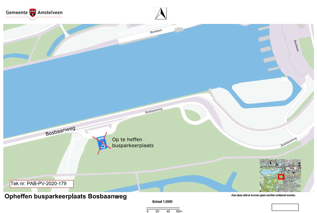 Burgemeester en wethouders van Amstelveen besluiten om de parkeerplaats langs de Bosbaanweg ten westen van het gebouw Bosbaanweg 5 als busparkeerplaats op te heffen. Dit gebeurt door het verwijderen van bord E8d van bijlage 1 van het Reglement verkeersregels en verkeerstekens 1990 (RVV 1990), zoals aangegeven op tekening PAB-PV-2020-179.
