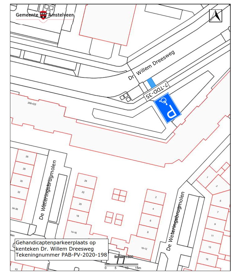 Burgemeester en wethouders van Amstelveen besluiten het parkeren te verbieden op een parkeerplaats langs de Dr. Willem Dreesweg, zoals aangegeven op tekening PAB-PV-2020-198, met uitzondering van het voertuig met het kenteken 7-TDD-35 (gehandicaptenparkeerplaats).