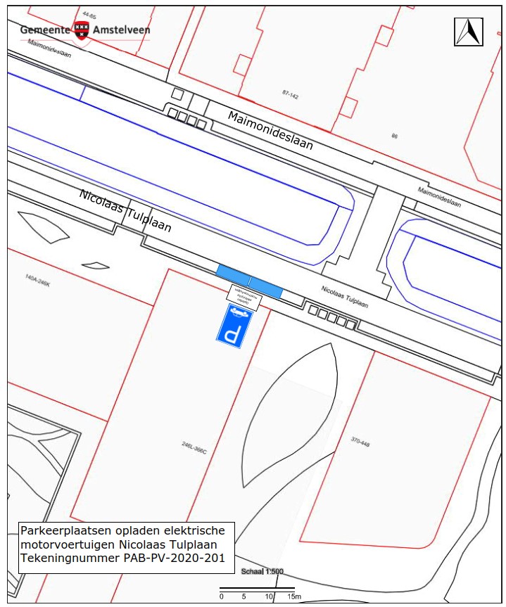 Burgemeester en wethouders van Amstelveen besluiten om in de Nicolaas Tulplaan twee parkeerplaatsen aan te wijzen als parkeerplaats voor het opladen van elektrische motorvoertuigen. De parkeerplaatsen mogen alleen gebruikt worden voor het opladen van deze elektrische motorvoertuigen.