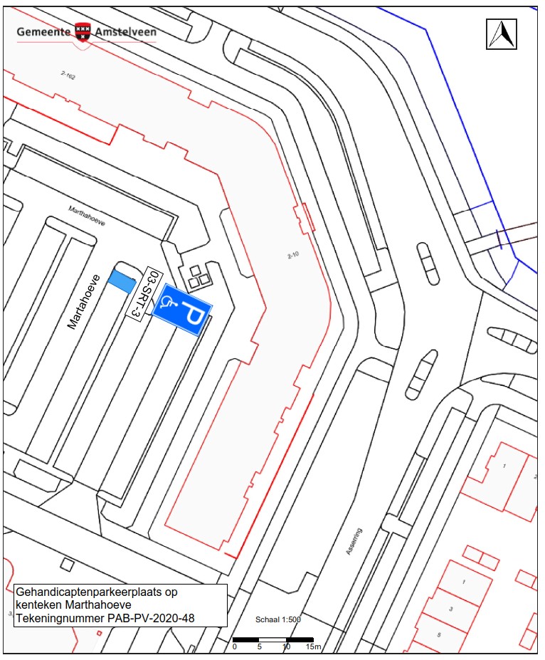Burgemeester en wethouders van Amstelveen besluiten het parkeren te verbieden op een parkeerplaats op het parkeerterrein van Marthahoeve, zoals aangegeven op tekening PAB-PV-2020-48, met uitzondering van het voertuig met het kenteken 03-SRT-3 (gehandicaptenparkeerplaats).