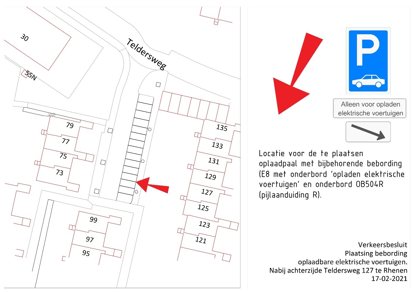 Z811616 Gemeente Rhenen - Verkeersbesluit tot het aanwijzen van een parkeervak uitsluitend bestemd voor het opladen van elektrische voertuigen op de parkeerplaats nabij Teldersweg 127, 3911 PW Rhenen – 3-3-2021