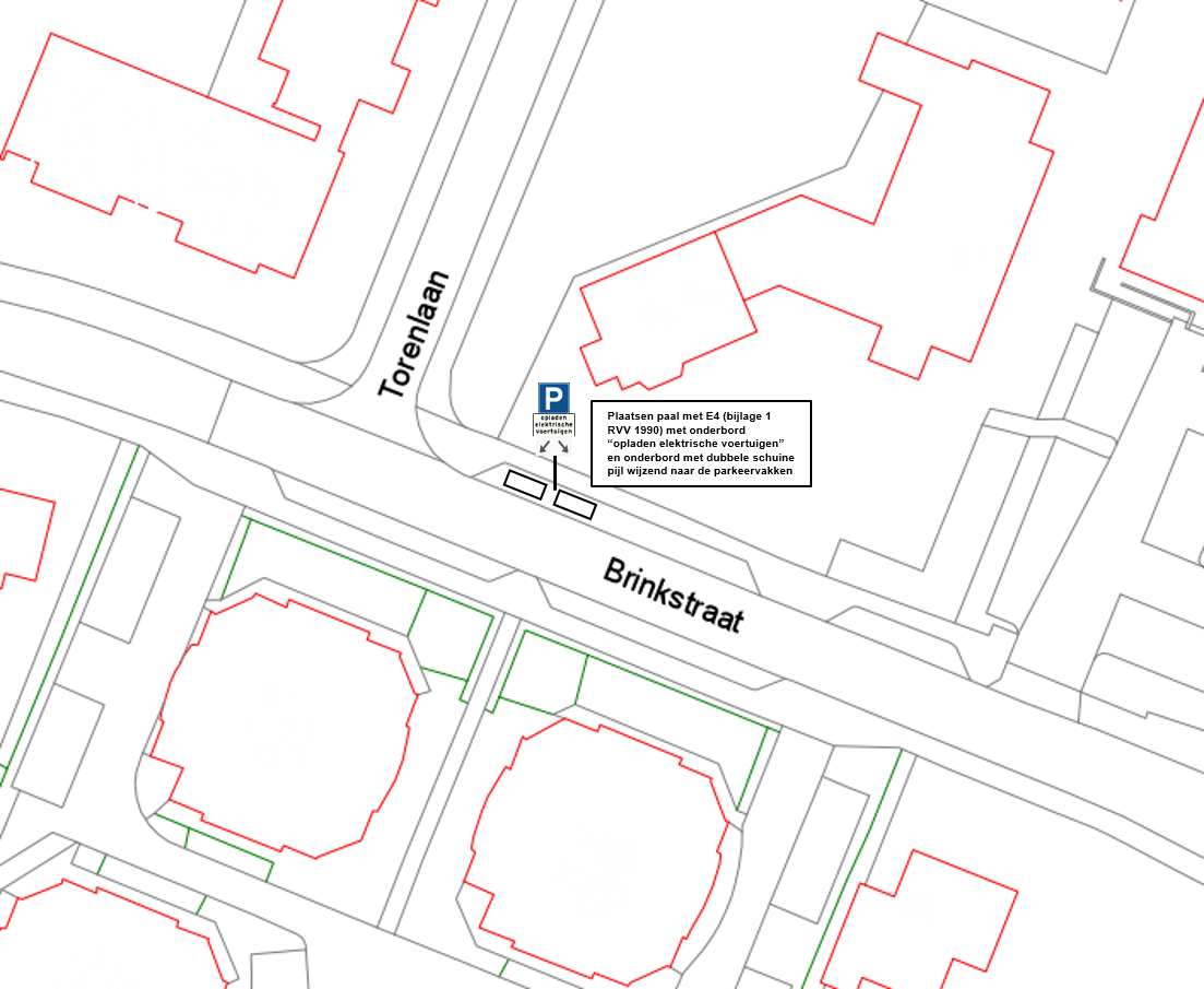 Door het plaatsen van bordmodel E4 van bijlage 1 van het Reglement Verkeerstekens en Verkeersregels 1990 (RVV 1990) met onderbord “opladen elektrische voertuigen” (OB20) en onderbord met dubbele schuine pijl wijzend naar de parkeervakken (OB504) twee parkeerplaatsen te reserveren als laadlocatie aan de Brinkstraat ter hoogte van huisnummer 78 volgens bijgevoegde situatietekening.