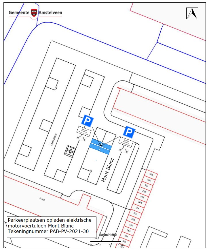 Burgemeester en wethouders van Amstelveen besluiten om op het parkeerterrein van Mont Blanc bij het flatgebouw Mont Blanc 2-168 vier parkeerplaatsen aan te wijzen als parkeerplaats voor het opladen van elektrische motorvoertuigen. De parkeerplaatsen mogen alleen gebruikt worden voor het opladen van deze elektrische motorvoertuigen.