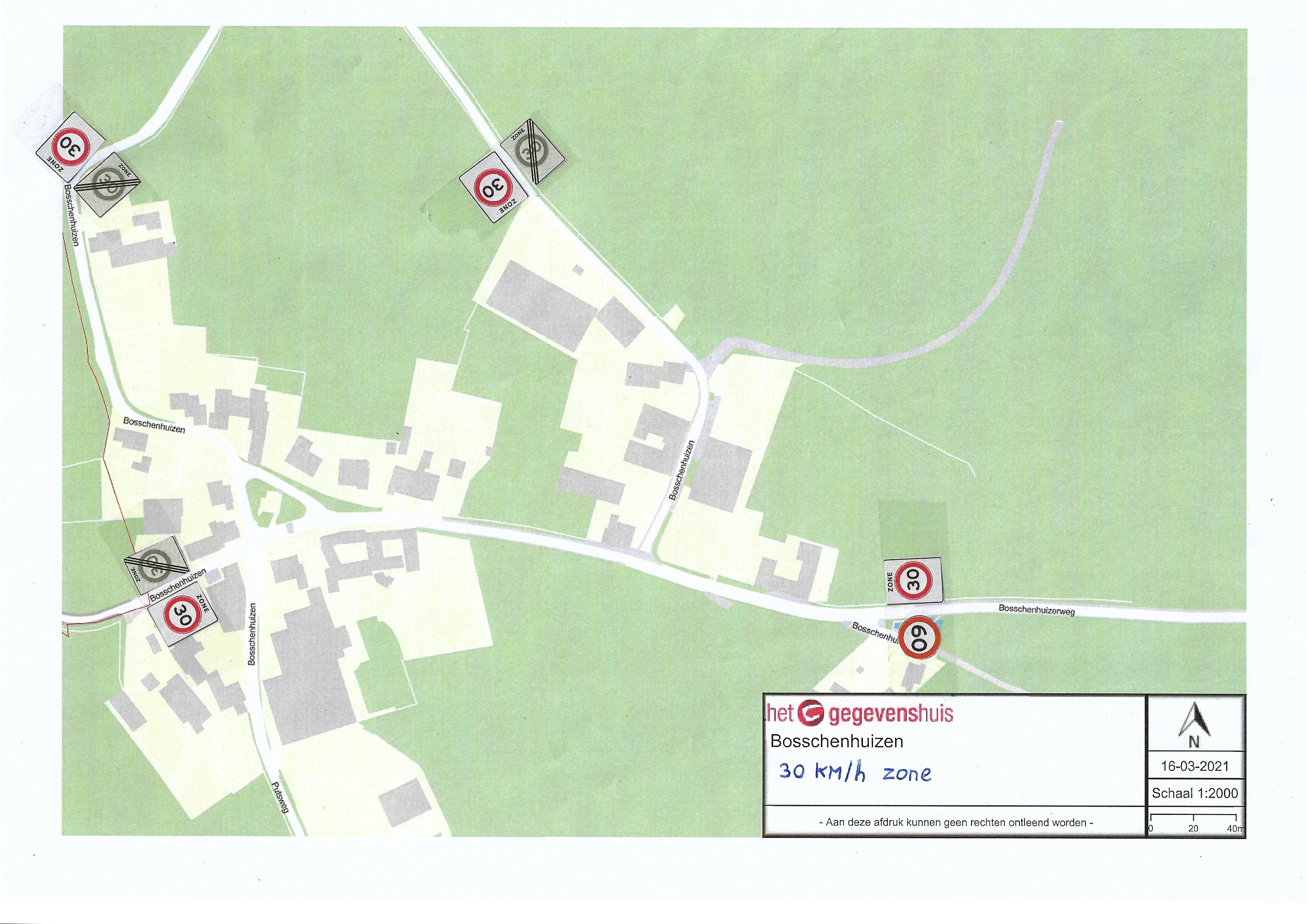 In verband met het in 2021 rehabiliteren van de Bosschenhuizerweg en het wijzigen van het snelheidsregime aldaar van 80 km/h naar 60 km/h zal tevens de kern Bosschenhuizen qua snelheidsregime worden gewijzigd. Op dit moment geldt er in Bosschenhuizen nog 50 km/uur. Voor de hele kern Bosschenhuizen zal een 30 km zone worden ingesteld.