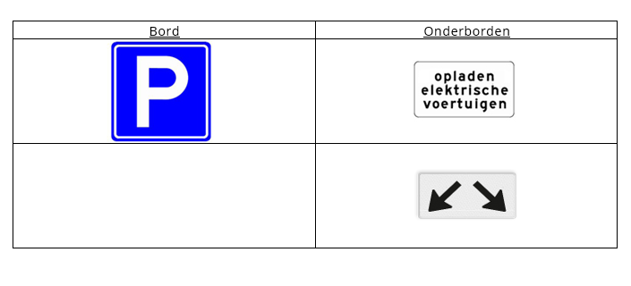• dit besluit kenbaar te maken aan de weggebruikers door middel van het plaatsen van bord E4 uit bijlage I van het Reglement verkeersregels en verkeerstekens 1990 met onderbord met daarop de tekst ‘opladen elektrische voertuigen’ alsmede met onderbord OB501 – schuin (links/rechts wijzend).