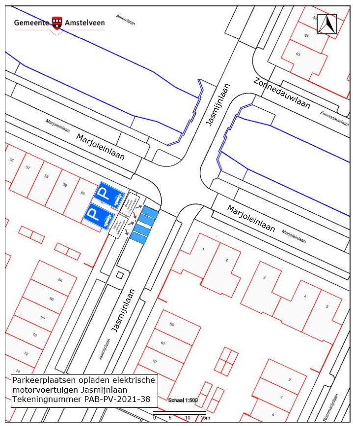 Burgemeester en wethouders van Amstelveen besluiten om in de Jasmijnlaan vier parkeerplaatsen aan te wijzen als parkeerplaats voor het opladen van elektrische motorvoertuigen. De parkeerplaatsen mogen alleen gebruikt worden voor het opladen van deze elektrische motorvoertuigen.